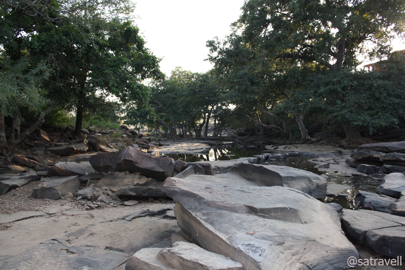 We then headed towards the ruins of the palace and the riverbed. No sooner we stepped on the water-eroded blackened granite slabs than a swarm of couples emerged from behind the rocks and large-sized granite boulders. Our sudden presence seemed to have disturbed them!