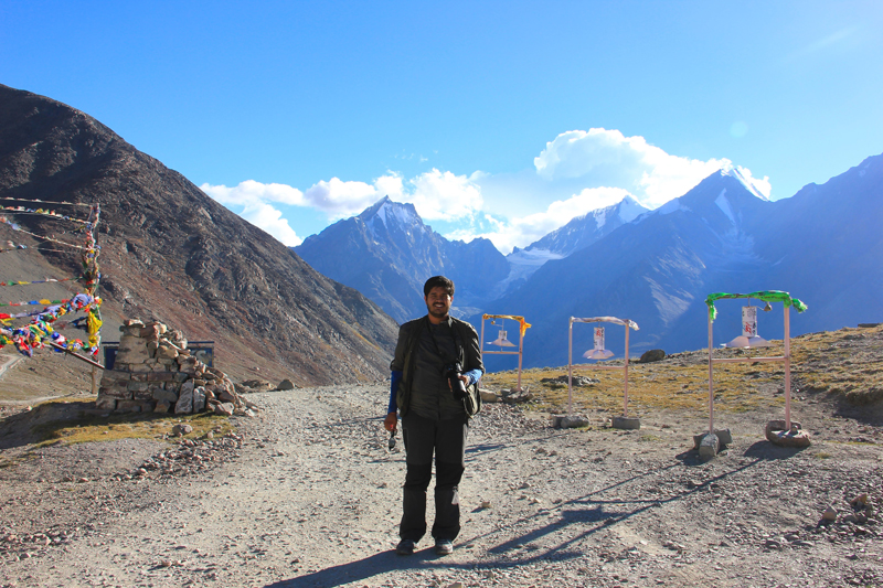 Surrounded by prayer flags and wind chimes, Yours Truly atop the Kunzum La