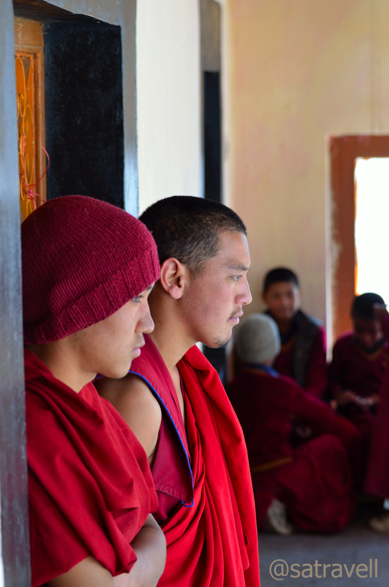 Driving on the true left bank of the river, past the iron-bridge that goes to the opposite bank, we steadily climbed on a neatly tarred narrow road to reach Ki village. The attractively perched ancient monastery of Ki, on a rocky hillock just above the village, was visible from the road itself. Within no time we reached the gompa and I was not surprised to see it thronged by both foreigners and domestic tourists. Both were found to be equally eager to photographically-capture various viewpoints the monastic life of Gelugpa sect had to offer. But the perspective appeared to be making a difference which was apparent.