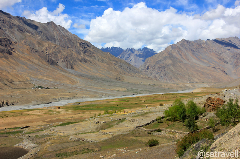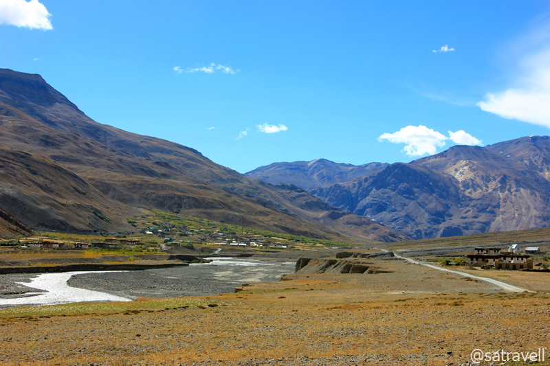 Intermittently descending and ascending to cross a few nallahs, the road to village Losar (4110m) followed the Spiti in an expansive glacial valley. Just before the village, the road crossed the Spiti River to reach its right bank as well as the Dongrimo nala or Suvita Lungpa. The last and final village of the Spiti valley towards the Kunzum La, Losar houses a couple of guesthouses, just a few shops, mud-brick houses painted white, etc. It is even possible to score the Chhang from the guesthouses of this village situated amongst cultivated fields, streams and poplars. Approaching from Hansa, the location of the village made for an extraordinary landscape.