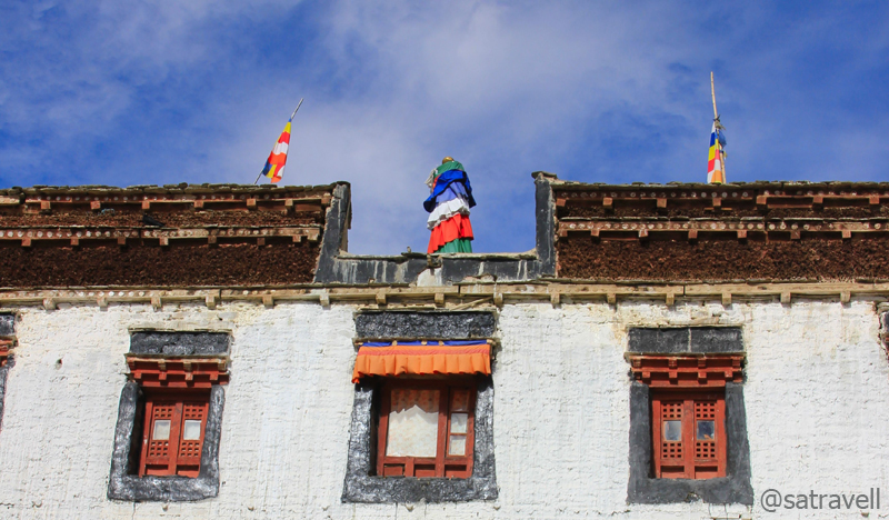 It took me 15 panting-minutes to climb up to the main entrance of the monastery. Due to an on-going renovation work in a section of the monastery-complex including that of the main entrance, I was directed towards an alternate way, dotted with Ibex heads pointing downwards from the sidewalls of the white-cells, to reach the main courtyard. Consisting of over thirty interconnected-buildings or cells, constructed over the centuries along the hill face, the monastery complex also comprises the ancient Chamba Ling temple.