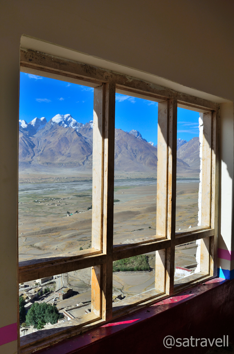 Outside, in the courtyard, a majority of monks had disappeared by now, only to partake in the Gompa’s mission and carry out their scheduled tasks for the day. Alongside the corridor, three young lamas were churning butter, in utensils made of copper, as well as cleaning lamps, part of their routine chores to prepare for morning and evening prayer ceremonies, usually the spells when the ageless Karsha comes to life. The view from the wooden-frames in windows of the corridor was simply superb. Contrasting with the red-brown colour of the window, the barren snow-capped Great Himalayan Range as well as the sedimentary ridge of the Zanskar Range located at the far end of Doda basin, under a cloudless blue sky, with fluttering prayer flags and ancient chortens as well as monastic cells pitched below, presented a timeless landscape.