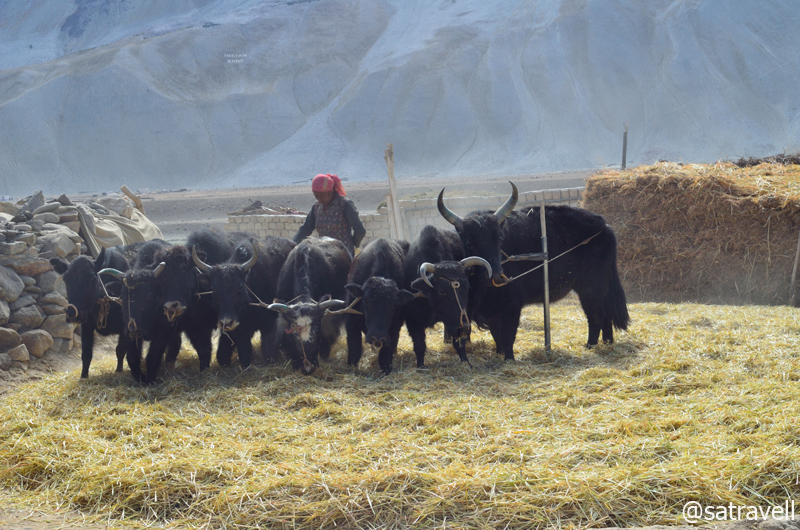 Dzo, a cross-breed of cow and Yak, thresh barley underfoot. More images from the region at Flickr Photoset