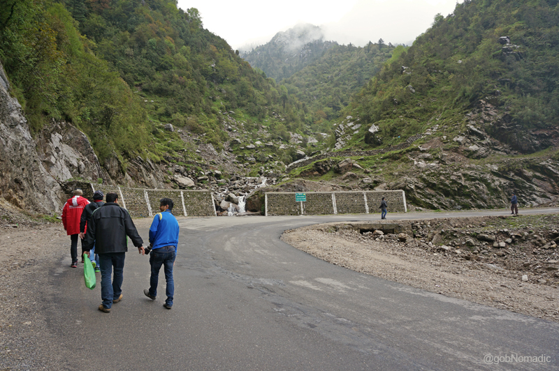 Post lunch we were allotted our accommodations for the next two days. The newly built acclimatisation hutments comprise dormitories and some rooms. A few of us, mostly the younger ones, were allotted the second acclimatisation hut at the Seventeenth Mile (3250m). The first centre was situated adjacent to the main market of the village. The second centre located ahead is set in a more natural surrounding; away from the humdrum of the market. The occasional traffic movement we noticed comprised army vehicles or tourists, etc. who were mostly heading towards the pass. Down below, two streams merged into one adding splash of whitish water in otherwise a silent densely wooded valley. The next briefing was scheduled early evening at Fifteenth Mile that day. At the Seventeenth Mile, the fellow travellers went into slumber one by one. I took my camera gear and headed on the road towards the Fifteenth Mile. It was still misty and the visibility was very poor.