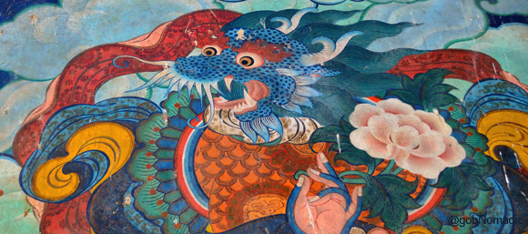 The main courtyard of the monastery is shaded by a large Bodhi tree. A blue-topped chorten beneath it intrigues the uninitiated visitors. The wide courtyard also serves as go-tha or vestibule. I headed inside the main assembly hall while my friend, founder of Chandigarh Bycycle, who accompanied me on this trip video-documented the ambience of the compound. The walls of the main hall of the monastery are painted in red, yellow, white and blue synthetic colours and beautified with ornate floral designs symbolic of the Tibetan style. The veranda walls are painted with the images of the Bon guardian deities of the four quarters, Chhok kyong-zi or the Lokpalas. Although, the monk-artists who executed these paintings took all possible care to preserve the thematic sanctity of the Tibetan art yet the glossy outcome of the enamel paints is at variance from the traditional Tibetan murals. The second important temple of the complex, the drup-khang or the meditation hall, situated adjacent to the du-khang, can only be visited by accomplished monks.