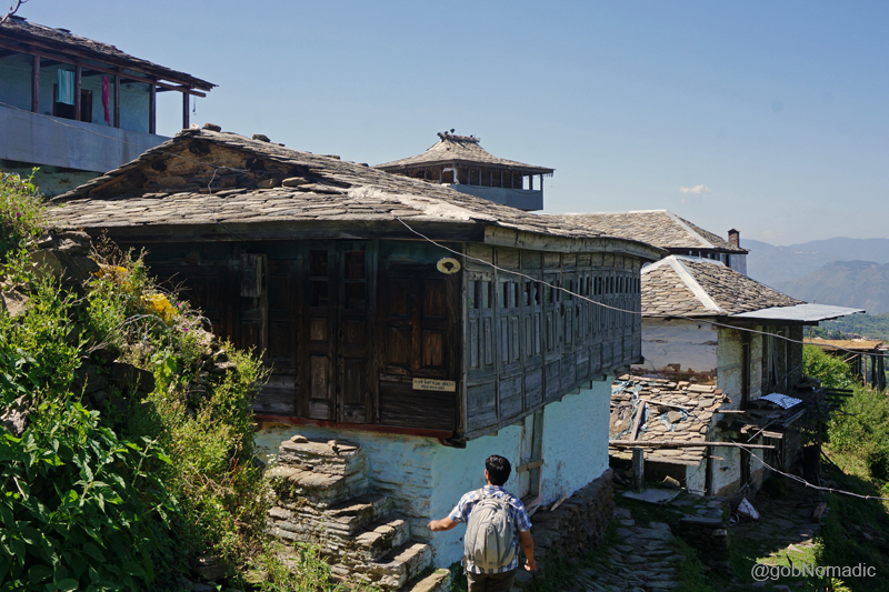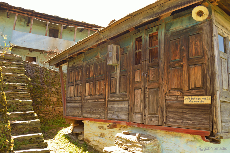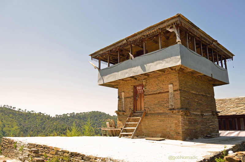 Down below towards the left, an olden temple-like structure caught our attention. We decided to make a visit to the tiny settlement where the temple was prominently noticeable. Driving through a wooded cover, we turn up on a dirt track which led to the settlement. A few minutes later, we were inside the courtyard of the stone and wood temple that was dedicated to Shirgul devta, the lord of Churdhar and the chief deity of the valley. The tower-styled main temple was built, employing the traditional Khasha architecture, on a raised platform. The doorway had numerous coins nailed on its frame; said to be signifying the answered prayers. The residence of priest, who was out of station that day, was at the back of the temple.