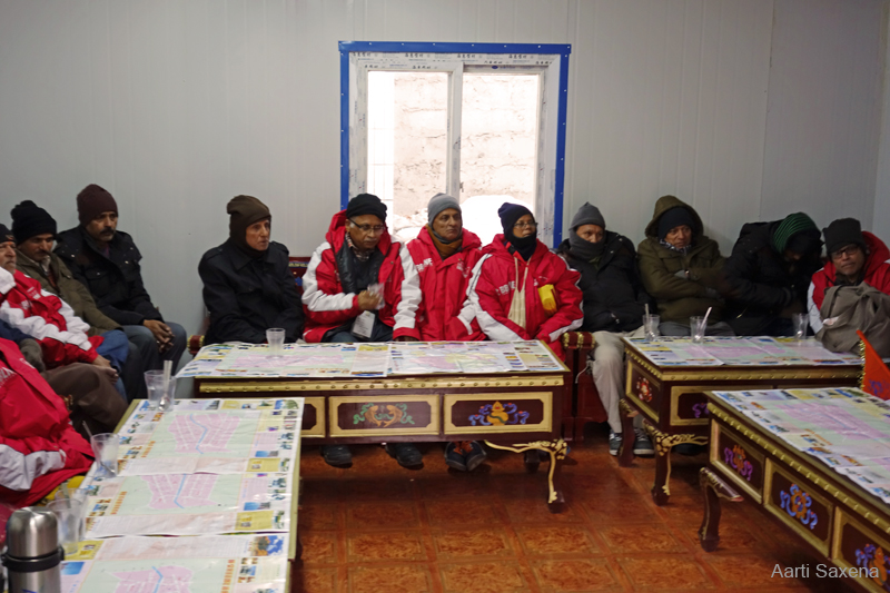 We stopped for camp lunch by the highway, near Satsang, after a couple of hours drive from Paryang. Our cooking team had hesitatingly prepared poori aloo subzi for packed lunch. I had a hearty meal after which I made a few snap records of the marshy highland around our campsite. The route ahead passes through a yellow steppe zone. Wherever the weather was clear the craggy snow-capped Himalayan peaks were visible to the south. Soon we were encircled by red rocky barrenness in a valley full of icy streams. Winter ice by the streams was yet to melt completely. As if out of nowhere, a check post, manned by Chinese police and excise officials, emerged where our documents were once again checked and verified. The inspector in-charge specifically announced, “No photography is allowed”. “Please”, he added later. Suddenly everyone inside the bus was staring at me. I decided to give my camera some rest.