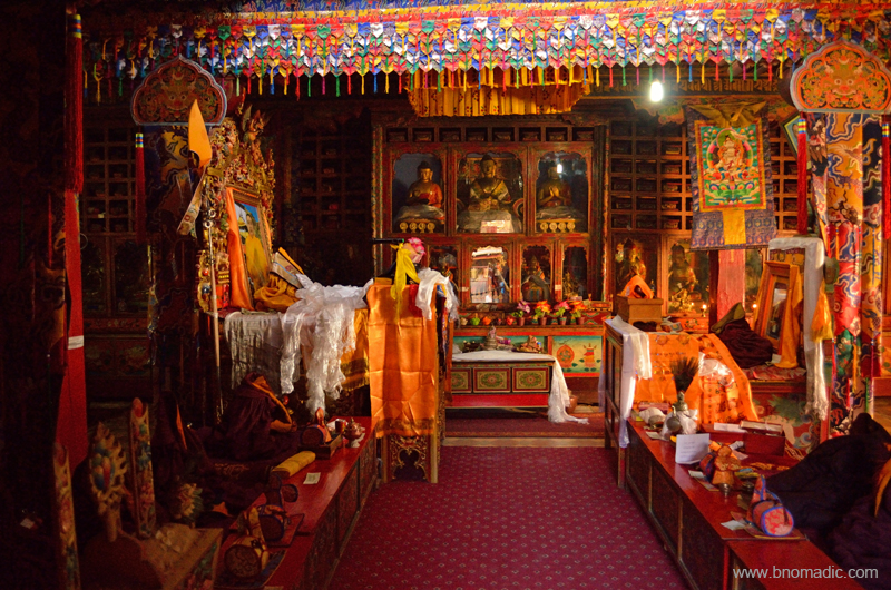 The central three figures in the assembly hall are Dusum Sangye – the Buddhas of the Three Times. Many of the smaller statues here were brought from Shepeling. More images at Flickr