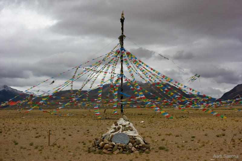 The rare natural colours that matter here are brown-earth, snowy white, sky and its reflection plus some occasional patches of greens. Everything else, including those of the prayer flags are a creation of mankind.