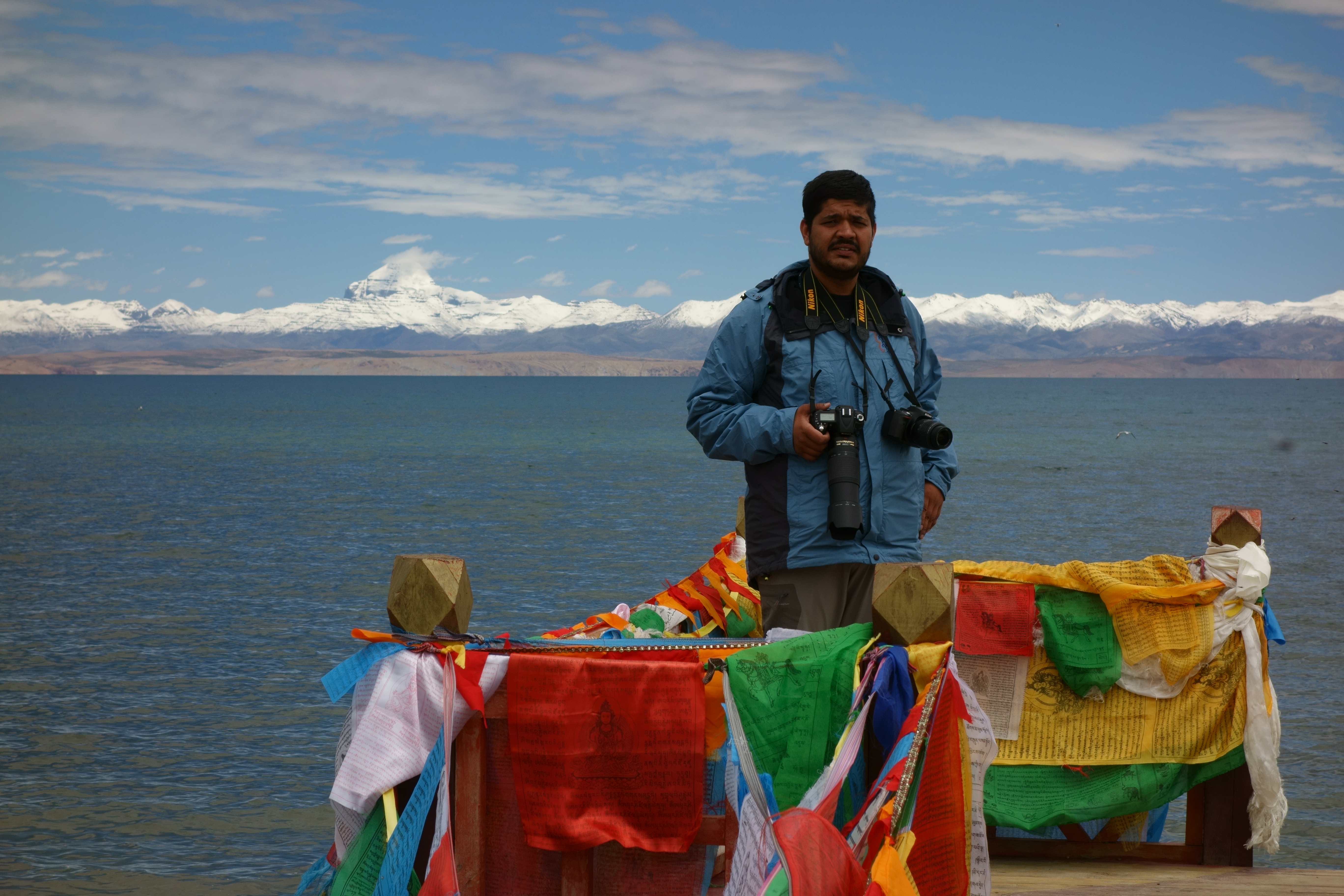 For two days, irrespective of the weather I ramble on along the shore; with a camera in hand resting only at night or for meals. At over 4500m, with the air being light, my heart beats faster but my feet are aware where they are stepping. Up there, the sun burns with a cleansing brilliance. The sands are whitish and soft underfoot. As the cold wind would rise every now and then, the miniature waves too would respond proportionately. Fenced by snowy range, the holiest of the earth’s lakes – the Mansarovar – with its two hundred square miles of water, stretches endlessly with unfathomable azure. The rare natural colours that matter here are brown-earth, snowy white, sky and its reflection plus some occasional patches of greens. Everything else, including those of the prayer flags are a creation of mankind.