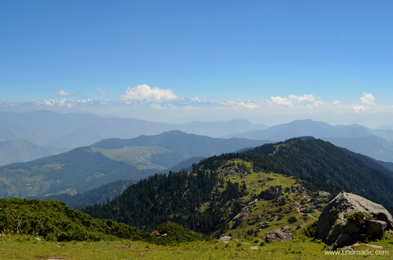 Beginning the descent to Nohradhar; north-faced in current frame. With the Great Himalayan Range in the backdrop, the other popular trail that leads to Chaupal is also visible on the lower ridge