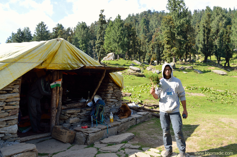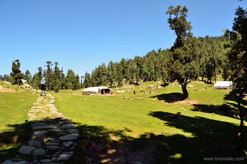 Next morning at 0730hrs we began our steep climb to the ridge above the settlement of Nohradhar and then proceeded along this gentle and lightly wooded ridge to reach the first popular campsite at Jamnala, also referred to as doosri. Part of a religious trail, the various rest sites on the route as we climb higher are known by pehli (2422m), doosri (2885m) and teesri (3258m), popularised by locals. These are also the sites where you could have a refill of water from fresh mountain springs. I’d recommend carrying good quantity of water with you from Nohradhar itself if you are not prepared to drink the spring water of mountains. Refraining from creating any further plastic on the mountains, we carried our bottles from the base and kept topping them up on the way from such streams; which is what I suggest. It took us nearly three hours to reach Jamnala at 2885m where a couple of enterprising families from Nohradhar had put up a seasonal dhaba providing a fixed menu of rice, dahl, tea and biscuits at a slightly premium rate. Surrounded by tall deodars, the Jamnala meadow is at a sunny spot and offers excellent camping grounds as well as water facilities. We took full advantage of the salubrious charm of the site and took a nap after polishing a plateful of dahl and rice.