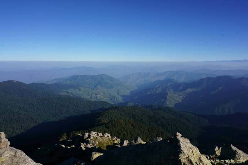 Next morning as I woke up and began to pack our gear, Aman had already made a return from the summit of Choor that offered a remarkable 360 degree view of lower Himalayas. Above a compilation of rocks and slates, a statue of Lord Shiva adds the required five feet to make it a 12,000 ft peak. The view wasn’t as free of haze as we had expected it to be. Shimla hills lay to the northwest and the Ghaggar plains to the southwest. Observed from the top, the lesser ridges appeared to be arid in contrast to the wooded patch we had hiked through yesterday. Far in the distance, the Great Himalayan Range majestically stood above everything else on the way.