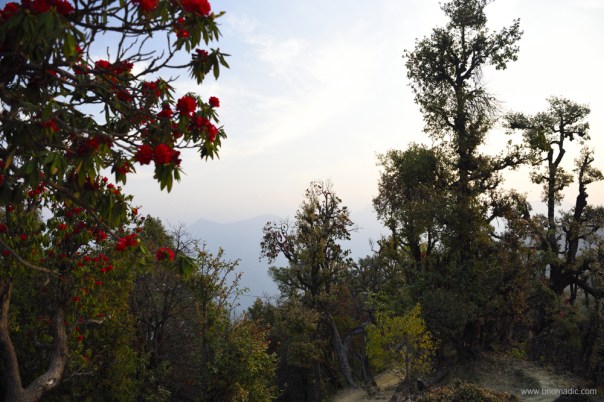 The hazy morning view, Rhododendrons, Oaks and the trail. More images from the region at Flickr