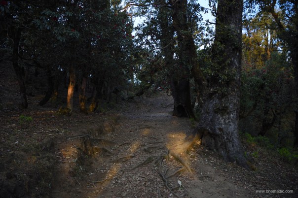 The trail to the top is fairly broad and passes through a forest mixed with oaks, rhododendrons among many others. The initial stretch of the trail was cemented before it was consumed by the dense forest. With incipient rays of the sun filtering in through the leaves and woods of the jungle, we made a steady progress up the trail. The Himalayan view was still not clear. The rising sun gave us hope as it began to peek over the horizon and painted the sky in marvellous shades of pink and purple. In few minutes, the mighty Chaukhamba imposingly stood above the clouds. The morning sun greeted the snowy peak with pink light. Summits of its neighbouring peaks too shone with the morning sunlight. Far in the distance, the ridgeline including the temple, bathed with the morning pink of the sun.