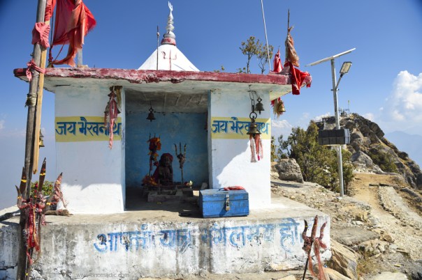 The administration had engaged a few workers to cement the pathway to the top of the temple from the pujari’s abode. The initial temple dedicated to Bhairon Nath (2570m) is located at a distance of 600m from here. Although, we were able to locate the snowy peaks but the overall Himalayan view was not as clear. We continued our steep ascent on a stony pathway. This last section of the pathway was steeper than the rest. Huffing and puffing, in a few minutes we were at the top. From Bhairon Nath temple, the top is hardly at a distance of 60m. The workers were busy patching up final set of staircase just below the main temple. The temple is built on a secured platform at 2589m.