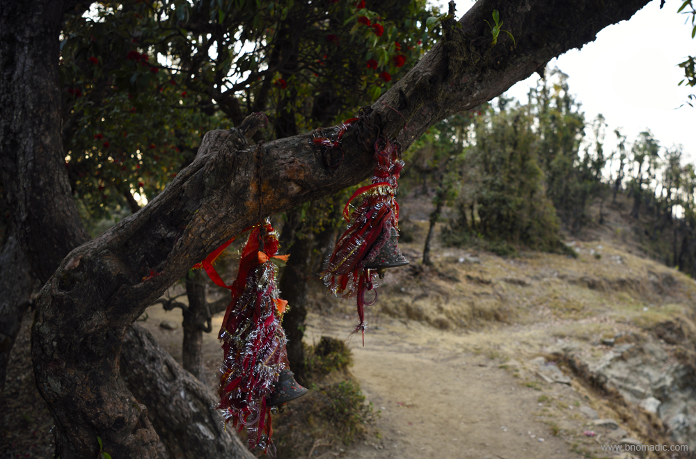 Temple bells and bright red chunni tied to a tree branch atop the second ridge crossing. More at Flickr