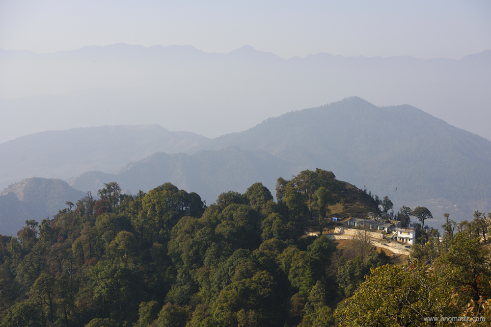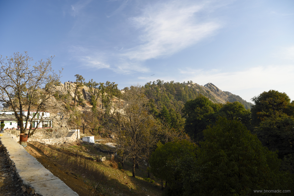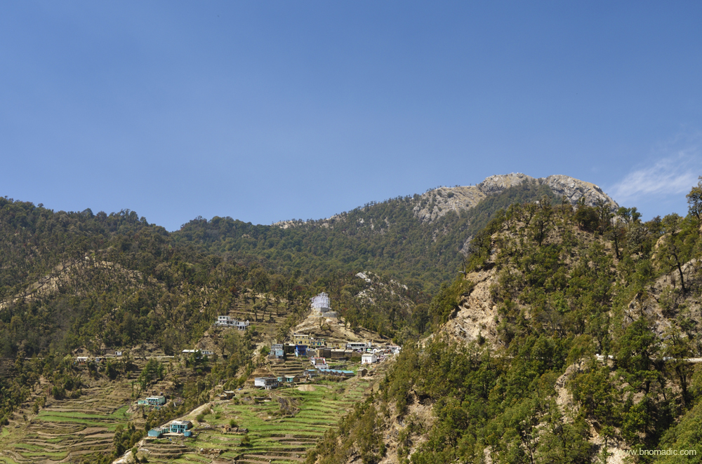 The Kartik Swami Temple atop the forested ridge (right of the frame) above the settlement of Kanak Chauri