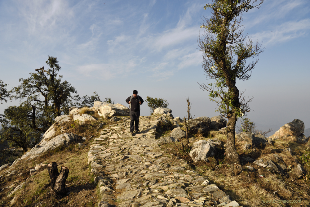 The trail to the top is fairly broad and passes through a forest mixed with oaks, rhododendrons among many others. The initial stretch of the trail was cemented before it was consumed by the dense forest. With incipient rays of the sun filtering in through the leaves and woods of the jungle, we made a steady progress up the trail. The Himalayan view was still not clear. The rising sun gave us hope as it began to peek over the horizon and painted the sky in marvellous shades of pink and purple. In few minutes, the mighty Chaukhamba imposingly stood above the clouds. The morning sun greeted the snowy peak with pink light. Summits of its neighbouring peaks too shone with the morning sunlight. Far in the distance, the ridgeline including the temple, bathed with the morning pink of the sun.