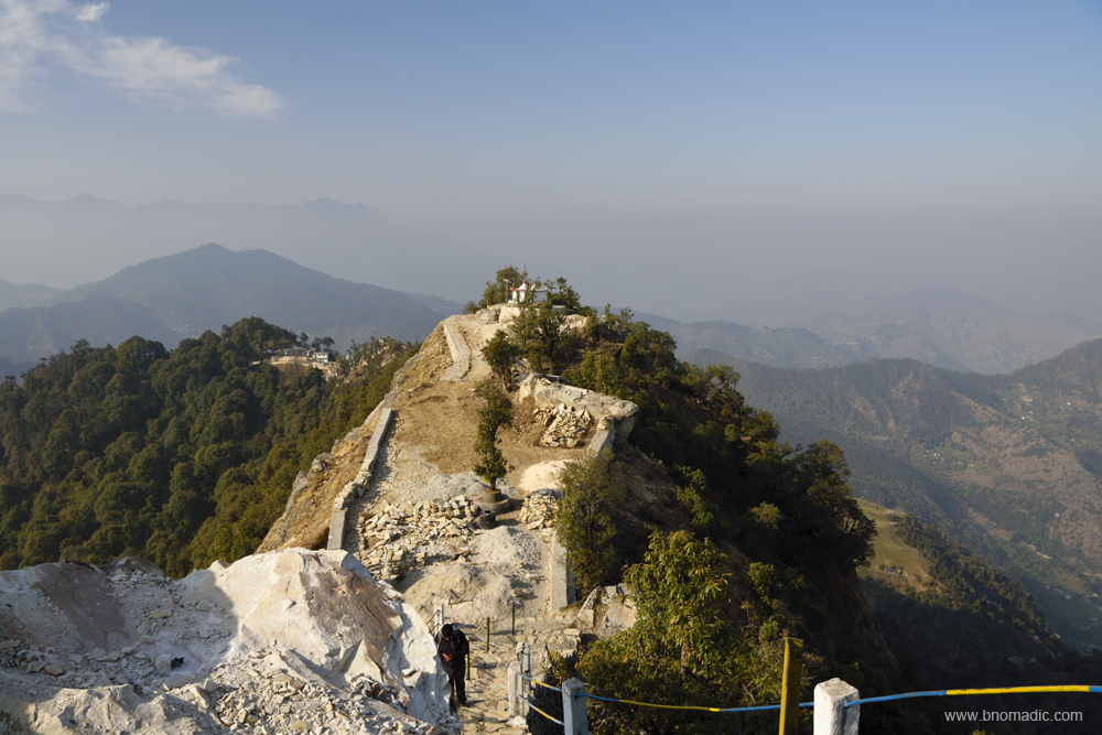 The administration had engaged a few workers to cement the pathway to the top of the temple from the pujari’s abode. The initial temple dedicated to Bhairon Nath (2570m) is located at a distance of 600m from here. Although, we were able to locate the snowy peaks but the overall Himalayan view was not as clear. We continued our steep ascent on a stony pathway. This last section of the pathway was steeper than the rest. Huffing and puffing, in a few minutes we were at the top. From Bhairon Nath temple, the top is hardly at a distance of 60m. The workers were busy patching up final set of staircase just below the main temple. The temple is built on a secured platform at 2589m.