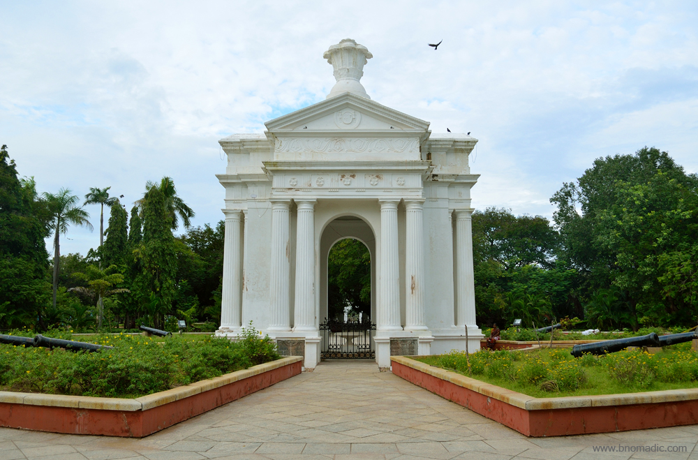 Facing the waves of the Bay of Bengal, the debris of the Town Hall, once known as Hotel de Ville and Mairie, lies scattered just next to the war memorial constructed by the French to commemorate the Pondy soldiers who died in the First World War. A favourite haunt of couples, the shady Government Park that has the famous Pondy memorial, whose pedimented facades are crowned by an urn, lies just behind. Along with this memorial which many consider an amusing surprise, a few columns that were brought from Gingee to Puducherry after the capture of its Fort in 1751 add colours to the Park. Being one of the most photographed landmarks, the monument is a revelation for it is built in commemoration of a harlot, whose charity had made the direct supply of water to the town possible.
