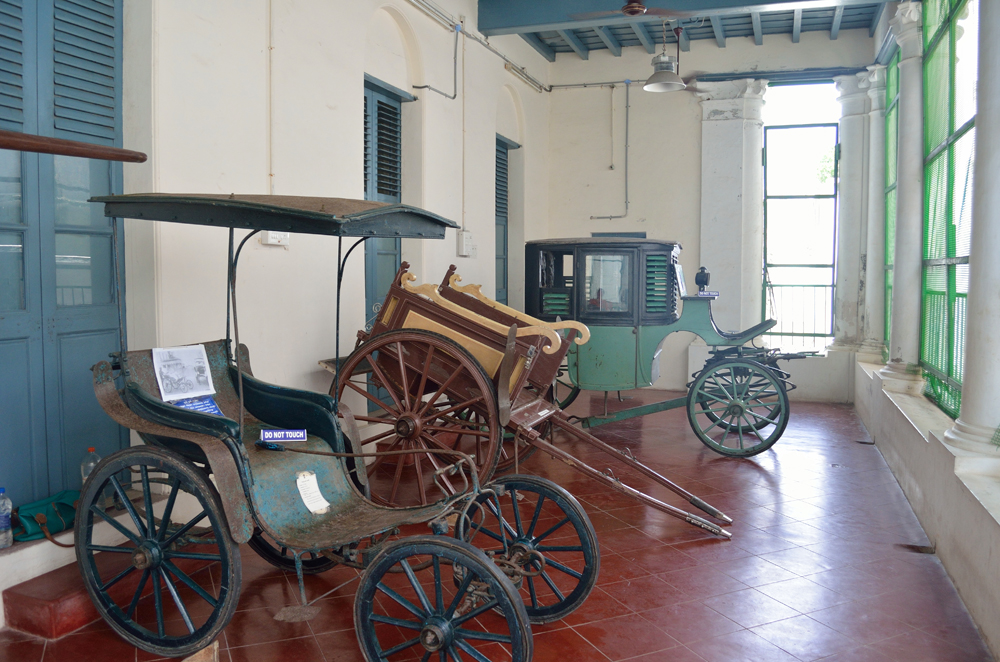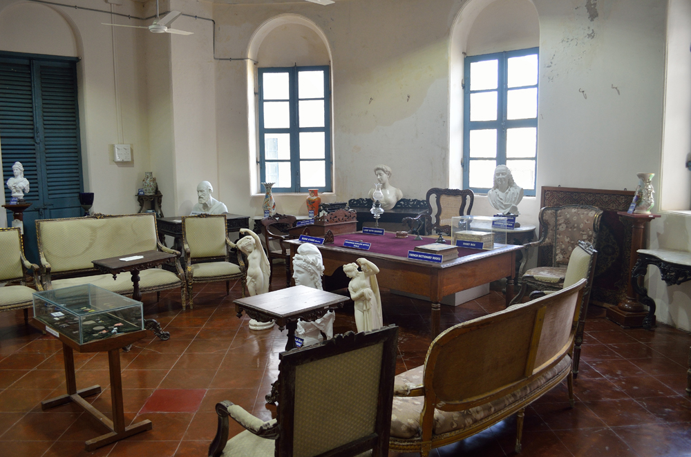 The foyer of the Pondicherry Museum, which is located in an erstwhile Law Building. The museum has a collection of rare bronze and stone sculptures from the Pallava and Chola dynasties as well as excavations from Arikamedu.