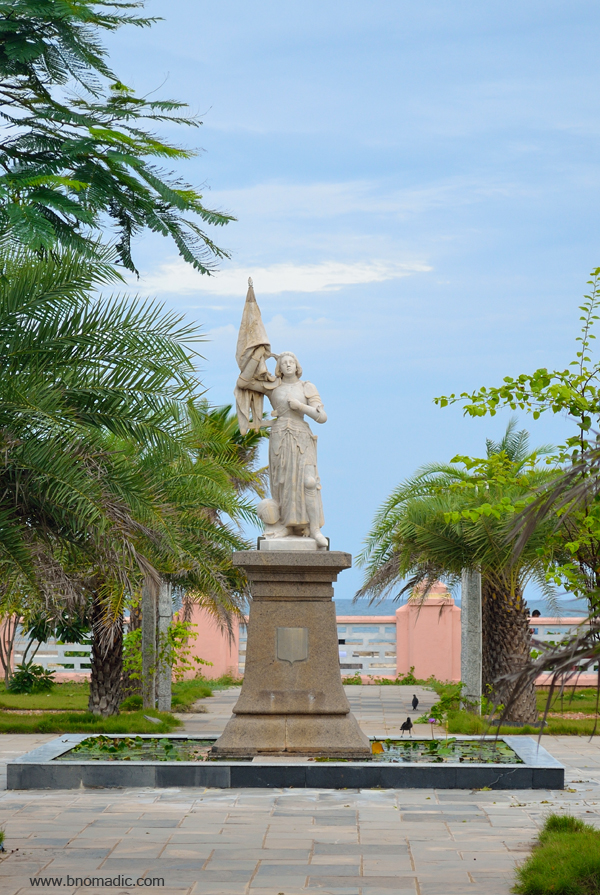 The statue of Joan of Arc against the backdrop of Sea; “erected in 1920, it has political significance as it bears witness to the rallying of the Church of France to the Republican regime. In Pondy, standing tall alongside British India, she is given the importance of a patron saint.”