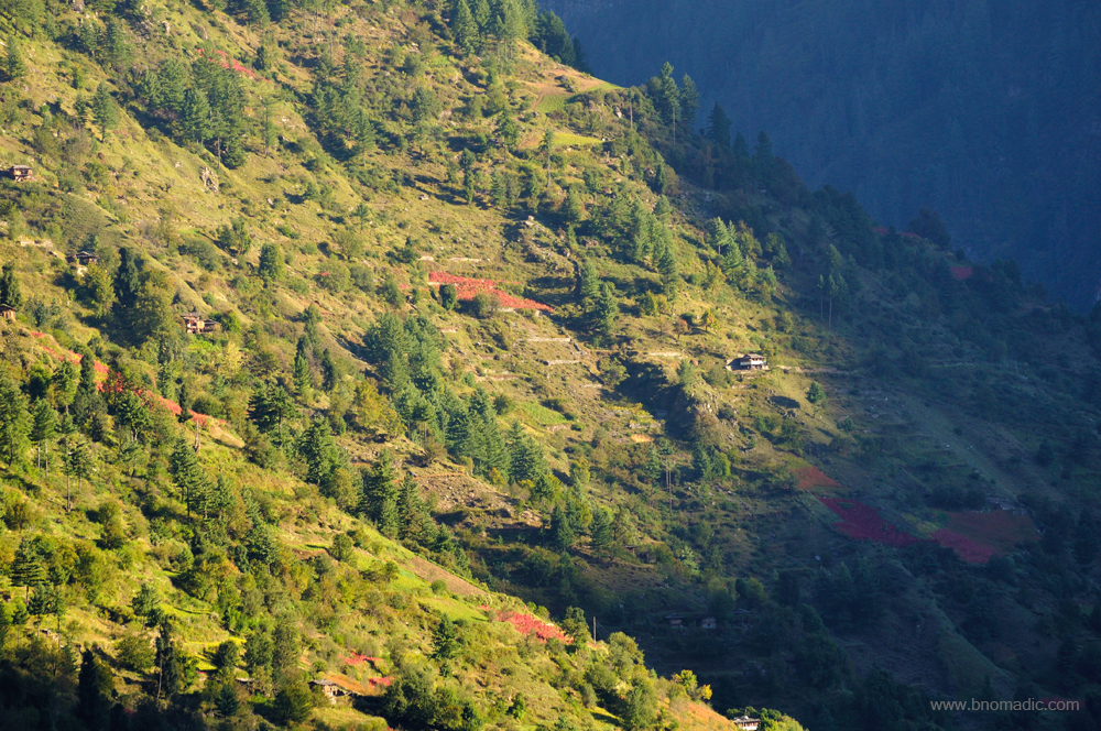 I try to make a sense of the geography of the valley. The river Rupin is not visible from the spot where I am standing. The level space at the bottom of the valley is inconsiderable; being usually not much broader than is sufficient for the passage of the river. On its both sides, the small level spots on the mountain faces are laid out into orchards. Generally, the arable land is scattered in narrow slips interspersed with incredible woods of pines and deodars. In between, the terrain is covered with green sward and countless varieties of loveliest wildflowers; there are clumps of forest and beds of juniper here and there, but the inclination is occasionally gentle, mostly ruled by sheer rocks which are exposed in most parts. The uppermost green belt forms the pasture lands, where shepherds tend their flocks in summer. These verdant meadows reach to above 4000m and are crowned by mountains covered with eternal snow or sterile peaked masses of granite. The snowline is not visible from the village clusters of Kwar as well as Dodra.