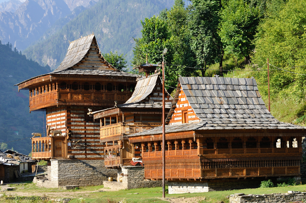 The valley experiences very heavy rain and snow fall which forced the architects of the temple to construct wooden structures to protect the devotees from cold; the slanted roofs provide these intriguing structures with a long life. These temples are not only the focal points of its religio-cultural activities and beliefs of the peoples, but also the veritable repositories of the religio-artistic expression of the art of the people. The wooden carvings of temples are different than those of the residential complexes. The carvings on houses depict designs of flowers, branches, trees or birds; whereas, the carvings on temples showcases deity and devils, monsters, animals, snakes, war scenes, etc. With rich floral devices, elegant verandas and pierced panels, the temples are a true masterpiece of the local wood-craft. A small detached balcony adds to the perfection. Round it hangs a fringe of wooden drops, which often produces a soft jangling in the wind. As is noticeable in the newly constructed as well as under construction houses, the wood-craft is still alive and thriving in the valley.