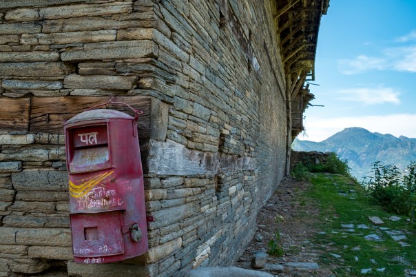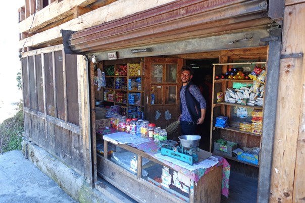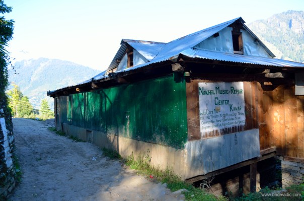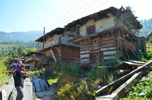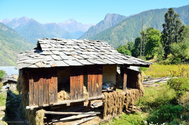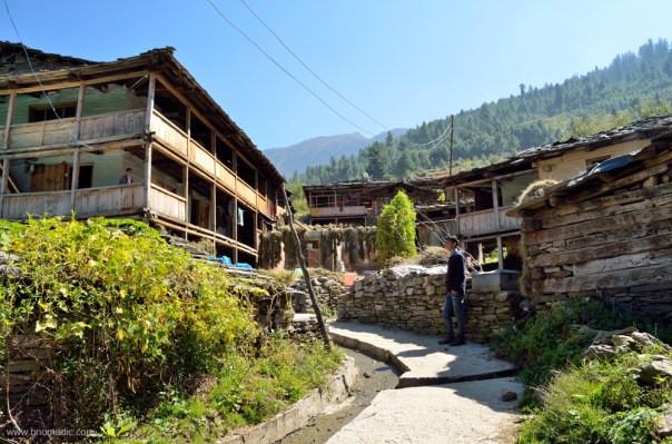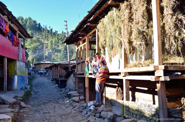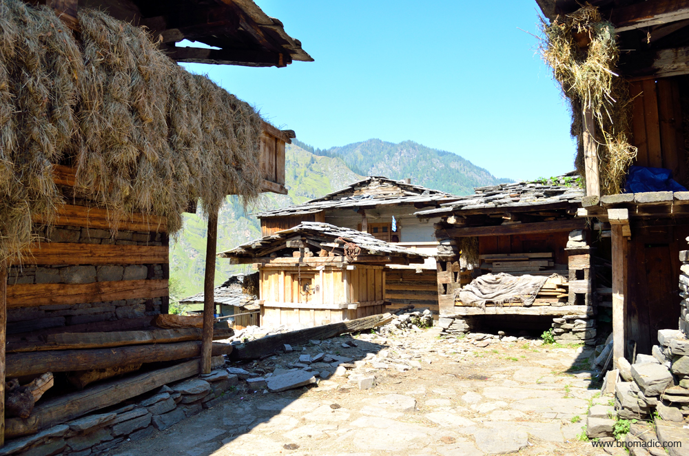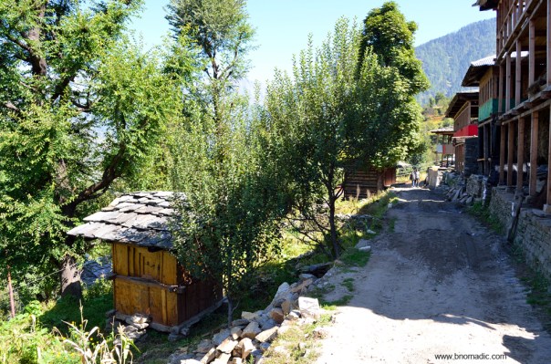 The main street of the village and a Kuthar, small wooden building meant to store grains and ration for the season.