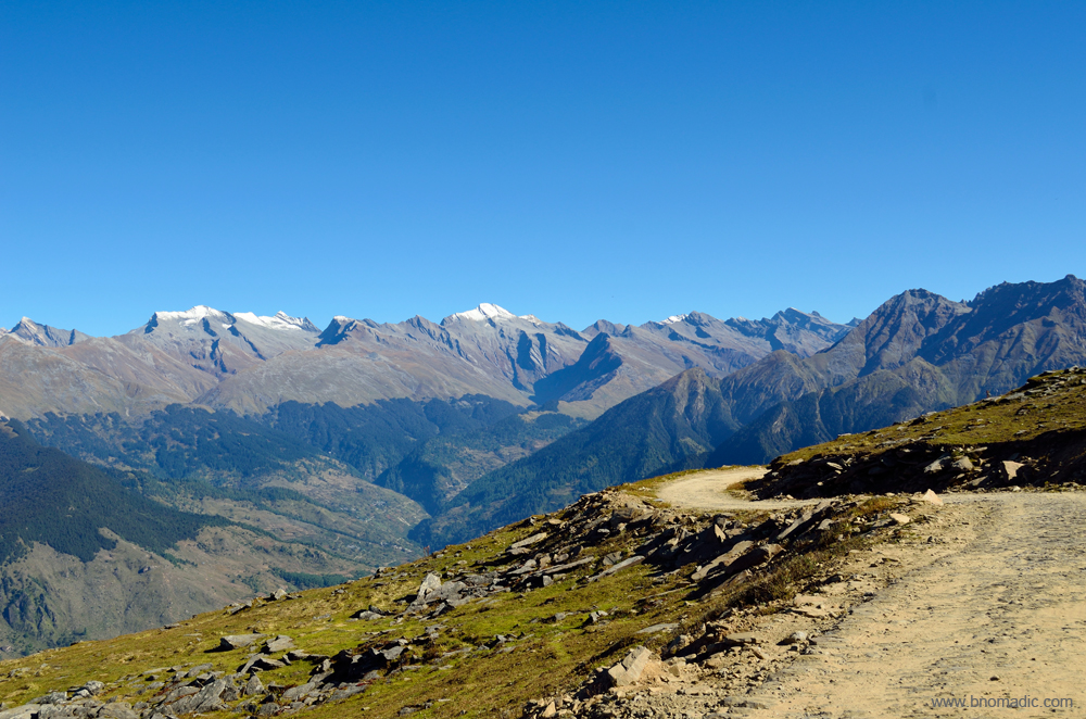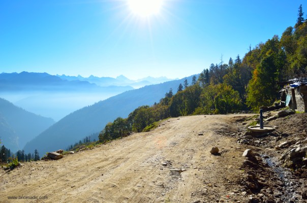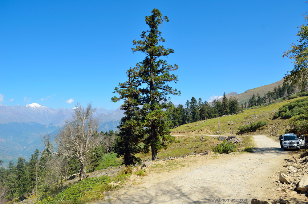 With a few more photo-halts, I am atop the pass after driving for about five hours from Sandasu. Once again, I get down from the vehicle. The panoramic display of the icy Himalayas is truly captivating. The sweeping mountainscape encompasses magnificence as well as beauty. Here everything is on the grandest scale, fragments of fallen rocks of immense bulk, hurried from the peaks above, and vast impending cliffs fringed with dark forests, and topped with mountains of indestructible snow, appear on two sides; vast meadows spread on rounded ridges encircled by verdure, and marginally populous villages encircled by fields and orchards towards the valley floor that hardly attracts my keenness which, at the moment, is devoted to minutely observing the Great Himalayan Show.