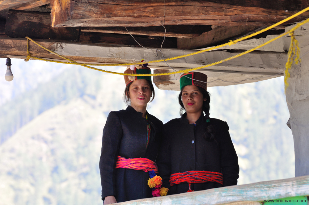 Kwari Belle in their traditional outfit; the bushehri topi has gradually replaced the traditional dhaathu to be a popular headgear. The black coat is called judki. Tying the colourful lakhoti around waist is part of the traditional outfit. The traditional silver jewelry is of course missing in this casual frame. Nowadays, women wear the traditional jewelry only during festivals or wedding ceremonies. More images from the region at Flickr