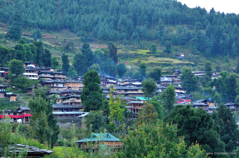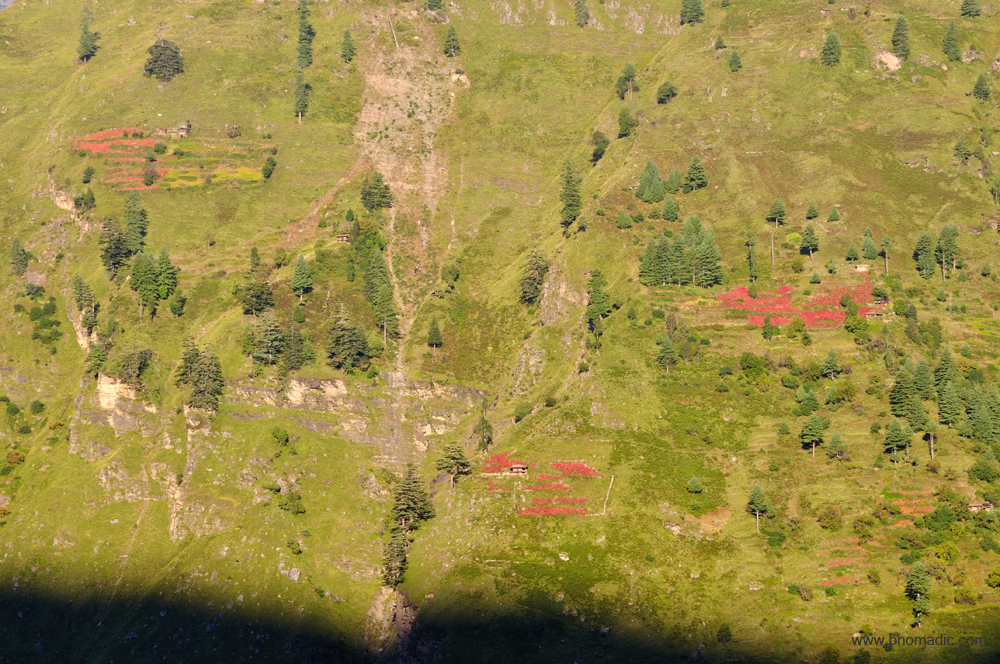 The sun rises in a clear sky next morning and by half past six; the face of the mountain across the Rupin is fully illuminated with the cheerful rays. On the other side of the valley, the village of Dodra looks like a tiny scrape on the green mountain face hanging below the Chanshal Pass. On the opposite mountain face, the fields appear to be bits and pieces of square that are sometimes red but mostly green. From a distance, the old wooden houses look like microchips placed in a brightly coloured canvas set in the rolling expanse of rocks. The soon-to-be-harvested Amaranth crop adds the fairylike redness to the green scape. As I lower my gaze, cubes of houses become clearer, colours glinting among the plethora of grey, white and beige, speckled with grass and cloths. In between, a spire or pole sticks out of the terrain like a needle. Around me, the moss, ferns, grass and wild flowers are a delight; and shine boundlessly in the morning sun. The morning breeze whispers and chucks itself among unswaying firs, chinars, deodars and walnuts; and only frail branches move. The wind brings fragrance of burning wood and that passes me in an instant.