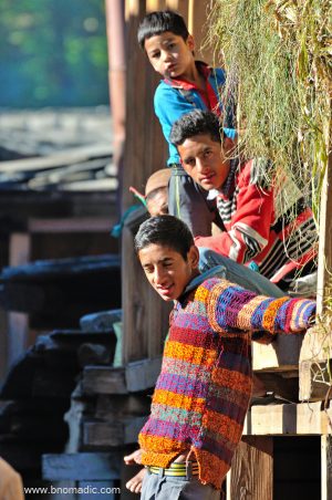 The residents are already busy with morning chores; girls cleaning utensils, men tending sheep, boys carrying buckets full of water to store for the day, elderlies setting up the courtyards to dry their ration, nuts and fruits. Men and women from almost every house are off to their fields to get grass and forage for their cattle. Winters are just around the corner and they have to carry extra bulk on their backs to stock for the long season that is fast approaching. Everyone is curious to see a geared up visitor in their village. I do my best to maintain my anonymity. Even Mangal is very supportive. At every turn, he does his best to clear the air about my being and informs his village folks that I am just a travel writer who wishes to write a book on our village – Kwar. Almost everyone instantly acknowledges and agree to share notes. Girls are still shy. There is a hint of wood smoke in the air. With steam pouring out of spouts of kettles; the warm aroma of smoke and steam is mingling with the putrefied stench of rotting garbage and water in the drains. As the noon nears, house ladies, many of whom are now back from the fields, gathers at the community washing point to wash their cloths. This could be any village of the valley, Mangal acknowledges as we trudge ahead.