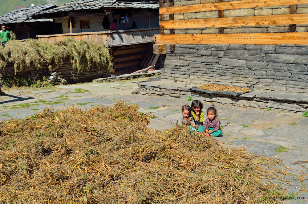 Young kids are curious to see an alien in their village. Winter-fodder for cattle is being sun dried in the courtyard
