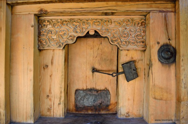 A typical entrance door of a Kuthar; notice the wood carvings and the traditionally styled door lock